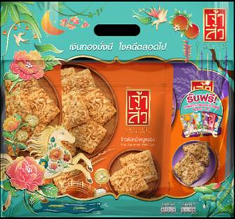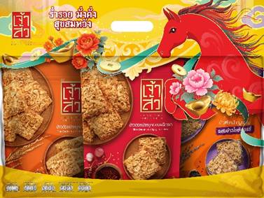 และข้าวตังหน้าหมูหยองผสมข้าวไรซ์เบอร์รี่ มาในแพ็กเกจสีสดใส ภายใต้คอนเซ็ปต์ ‘เงินทองมั่งมี โชคดีตลอดไป’ เปรียบเหมือน ‘ม้าวิ่งอยู่ในทุ่งหญ้า’ ถือเป็นความอุดมสมบูรณ์และการเริ่มต้นใหม่ โดยลวดลาย ‘ม้า’ ซึ่งเป็นสัตว์ประจำปีนักษัตรนี้ สะท้อนถึงความกล้าหาญ และความคล่องแคล่ว เช่นเดียวกับ ‘ผลพีช’ ที่บ่งบอกถึงความร่ำรวย อุดมสมบูรณ์ และอายุยืน โดยความพิเศษในชุดนี้
