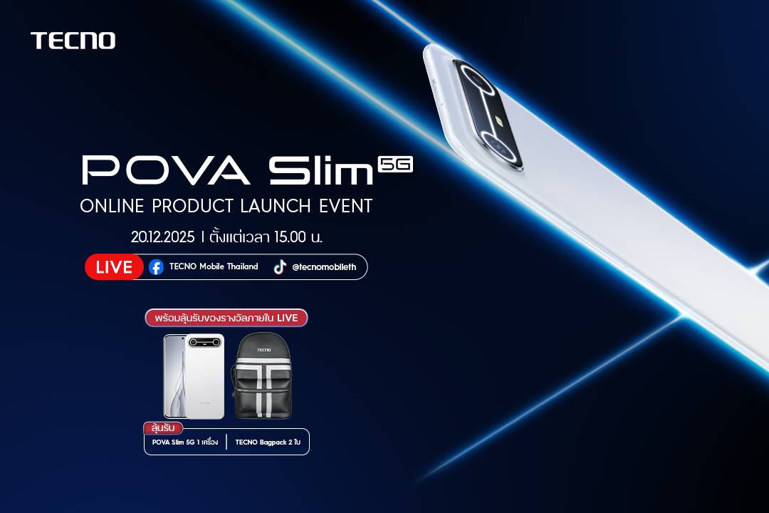 และ TikTok: TECNO Mobile TH ในวันที่ 20 ธันวาคม 2568 เวลา 15.00 น. เป็นต้นไป ภายในไลฟ์จะได้พบกับแขกรับเชิญพิเศษ ที่จะมาร่วมเจาะลึกดีไซน์อันโดดเด่นของ POVA SLIM แบบทุกมิติพร้อมเติมความสนุกและสีสันตลอดการไลฟ์และยังมีไฮไลท์สุดพิเศษที่ทุกคนรอคอยกับกิจกรรมลุ้นรับ TECNO POVA SLIM จำนวน 1 เครื่อง และของรางวัลอีกมากมายสำหรับผู้โชคดีภายในไลฟ์เท่านั้น
