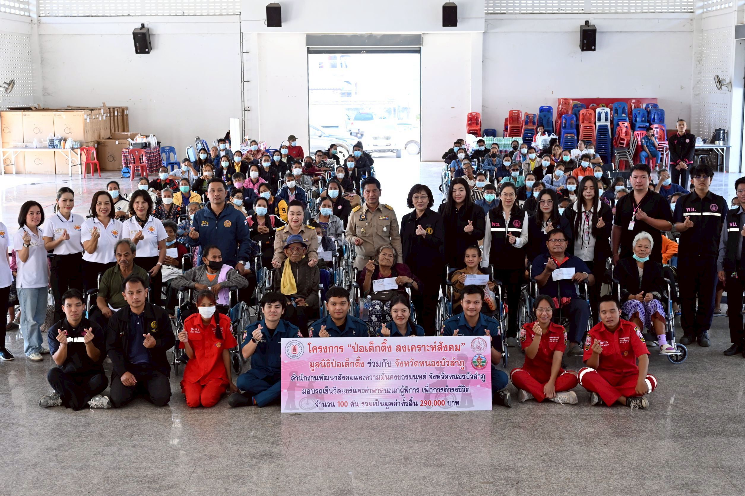 มูลนิธิป่อเต็กตึ๊ง ขยายความช่วยเหลือผู้พิการด้อยโอกาส มอบรถเข็นวีลแชร์พร้อมค่าพาหนะแก่ผู้พิการ 100 คน ในพื้นที่จังหวัดหนองบัวลำภู เพื่อถวายเป็นพระราชกุศลแด่สมเด็จพระนางเจ้าสิริกิติ์ พระบรมราชินีนาถ พระบรมราชชนนีพันปีหลวง ณ ที่ว่าการอำเภอเมืองหนองบัวลำภู อำเภอเมือง จังหวัดหนองบัวลำภู