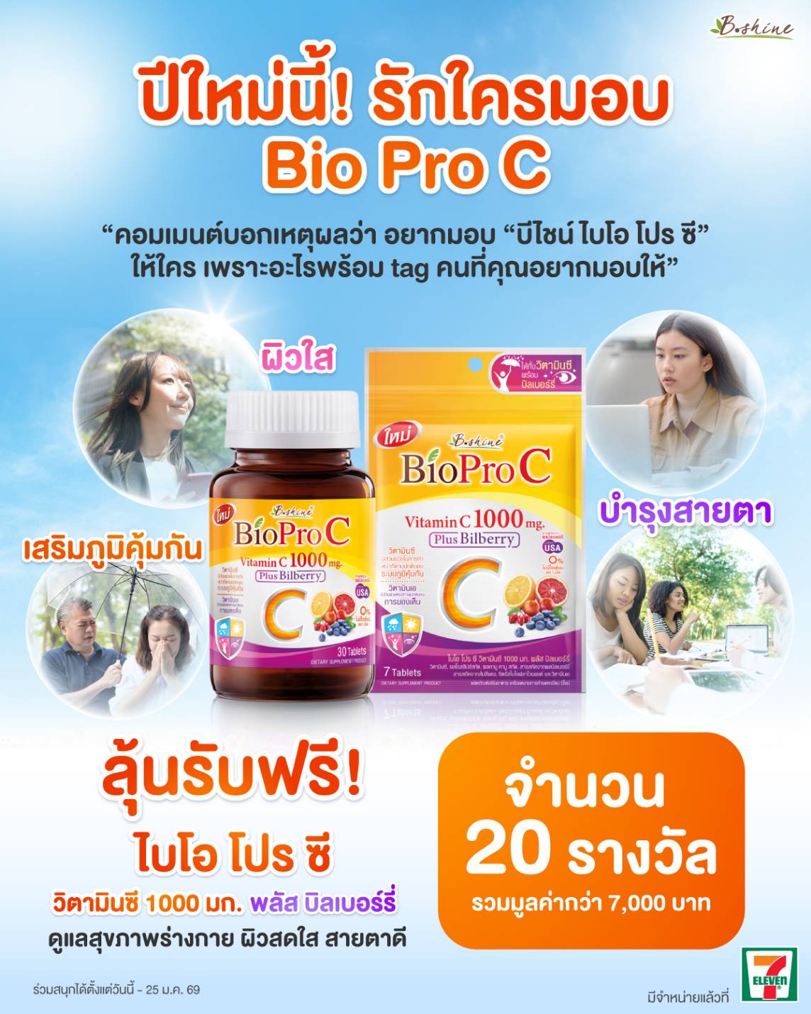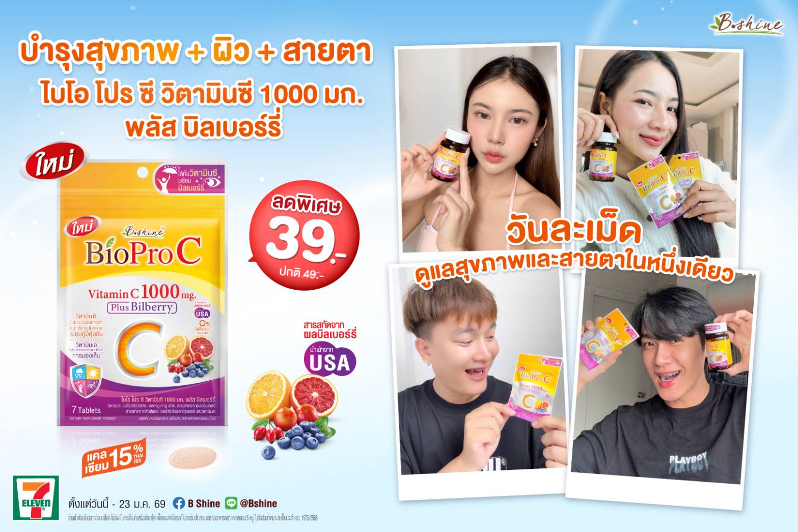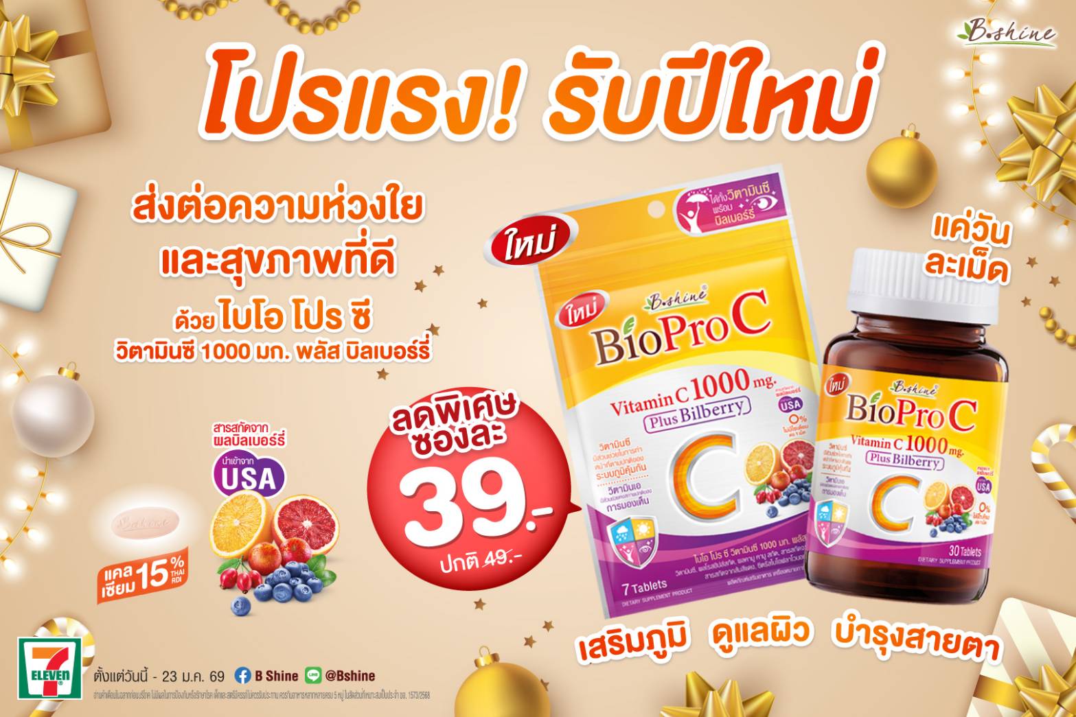 เพื่อเป็นของขวัญสุขภาพดีรับปีใหม่ บีไชน์จัดโปรโมชั่น “ไบโอ โปร ซี” แบบซอง (บรรจุ 7 เม็ด) ลดราคาพิเศษเหลือเพียง 39 บาท (จากราคาปกติ 49 บาท) และสิทธิพิเศษสำหรับสมาชิก All Member ลดเพิ่มเหลือเพียง 38 บาท สามารถหาซื้อได้แล้ว ตั้งแต่วันนี้ – 23 มกราคม 2569 ที่ร้านเซเว่น อีเลฟเว่น ทุกสาขาทั่วประเทศ และขอเชิญชวนทุกท่านร่วมสนุกกับกิจกรรม "ปีใหม่นี้..รักใคร ต้องมอบ Bio Pro C" บีไชน์ชวนทุกคนมาแชร์เหตุผลดีๆ ว่าปีนี้อยากดูแลใครเป็นพิเศษ ลุ้นรับฟรี! Bio Pro C Vitamin C 1000 mg. Plus Bilberry บำรุงผิวใส เสริมภูมิคุ้มกัน ดูแลดวงตาแบบครบสูตร