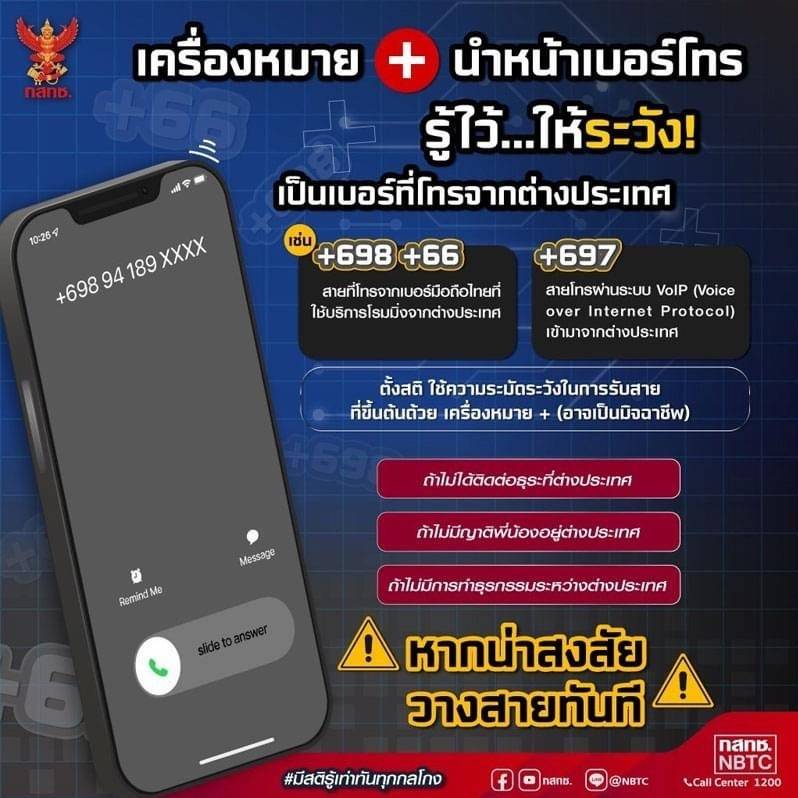 สำนักงาน กสทช. ขอเน้นย้ำว่า ขอให้ใช้ความระมัดระวังในการรับสายที่ขึ้นต้นด้วยเครื่องหมาย เพราะอาจเป็นมิจฉาชีพ หากรับสายแล้วน่าสงสัยหรือไม่แน่ใจให้วางสายทันที นอกจากนี้ หน่วยงานของรัฐไม่มีนโยบายการติดตามหรือดำเนินคดีผ่านการโทรศัพท์หรือวีดีโอคอลหาประชาชน
