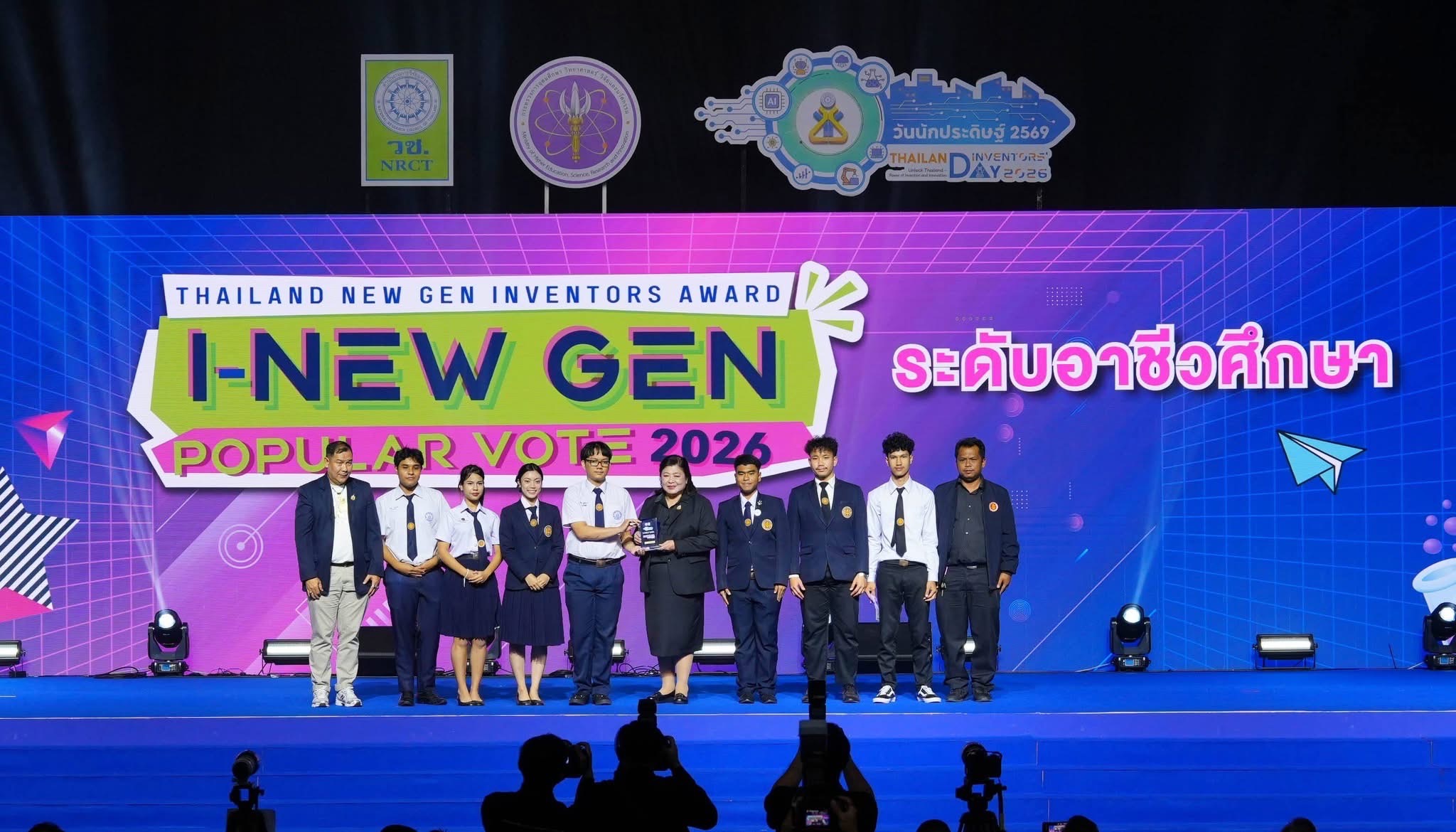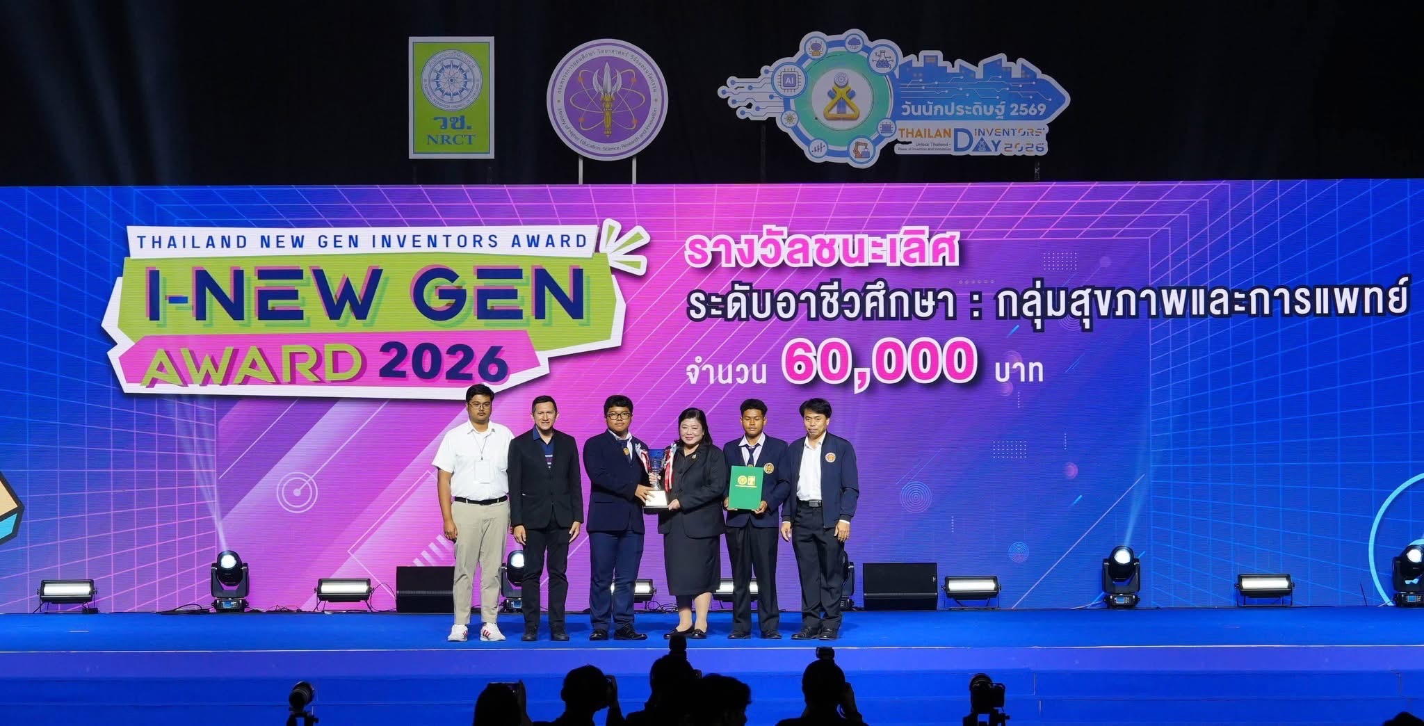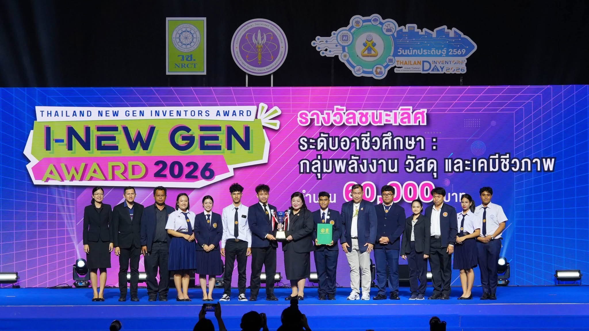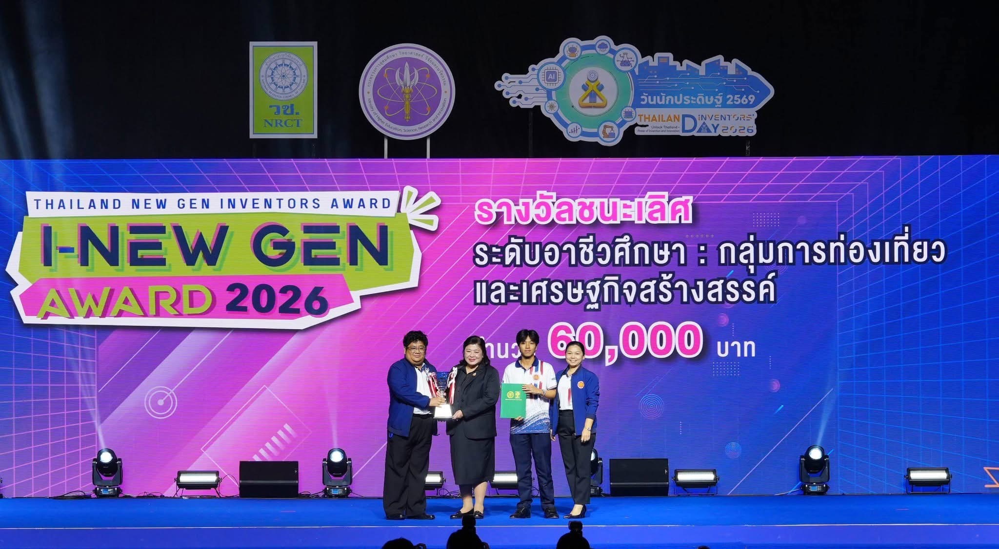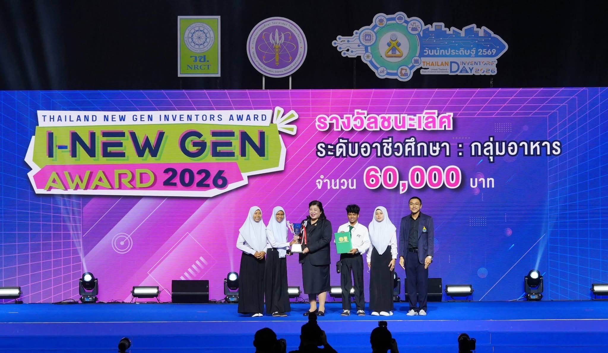 วันที่ 9 มกราคม 2569 สำนักงานการวิจัยแห่งชาติ (วช.) กระทรวงการอุดมศึกษา วิทยาศาสตร์ วิจัยและนวัตกรรม จัดพิธีมอบรางวัลสิ่งประดิษฐ์ ระดับมัธยมศึกษา ระดับอาชีวศึกษา และระดับอุดมศึกษา ภายใต้โครงการ "Thailand New Gen Inventors Award 2026 (I-New Gen Award 2026)" ภายในงานวันนักประดิษฐ์ 2569 (Thailand Inventors’ Day 2026) ท่ามกลางบรรยากาศที่เต็มไปด้วยความตื่นเต้นและเสียงเชียร์จากผู้ร่วมงาน โดยมี ดร.วิภารัตน์ ดีอ่อง ผู้อำนวยการสำนักงานการวิจัยแห่งชาติ ประธานในพิธี พร้อมด้วยคณะกรรมการผู้ทรงคุณวุฒิ และคณะผู้บริหารสำนักงานการวิจัยแห่งชาติร่วมแสดงความยินดี ณ ศูนย์นิทรรศการและการประชุมไบเทค บางนา กรุงเทพมหานคร