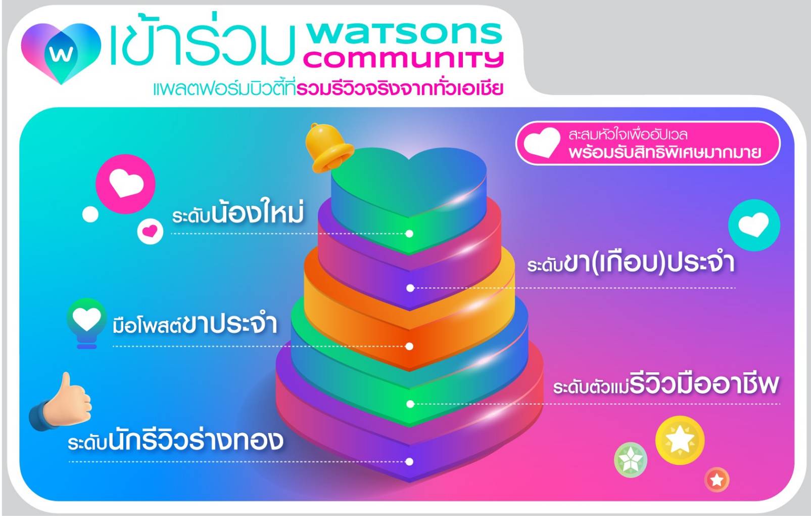• ร่วมแบ่งปัน Watsons Community มันคือ พื้นที่สร้างสรรค์สำหรับทุกคน เริ่มต้นสร้างโปรไฟล์ของคุณ เพื่อรีวิวสินค้าที่ชื่นชอบ ถามข้อสงสัยเกี่ยวกับบิวตี้ไอเทม หรือแชร์ทริคการดูแลตัวเอง พร้อมสะสมคะแนนและเลื่อนระดับสู่การเป็นที่สุดของนักรีวิวร่างทอง เพื่อแลกรับของรางวัลมากมาย อาทิ สกินแคร์ & บิวตี้ไอเท็มมากมายจากแบรนด์ชั้นนำ
