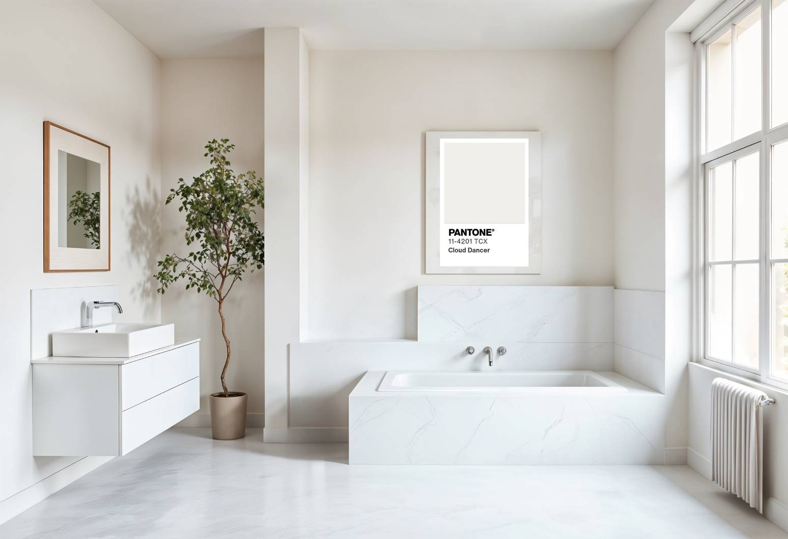 · โดดเด่นไม่หลุดเทรนด์ด้วยสี Cloud Dancer ที่กำลังมาแรงเป็นอันดับหนึ่ง หลังได้รับเลือกจาก Pantone ให้เป็นสีแห่งปี 2026 โดยสีขาวปุยเมฆอบอุ่นช่วยสร้างบรรยากาศแห่งความสงบและโปร่งสบายในห้องน้ำ พร้อมขับให้เฟอร์นิเจอร์และอุปกรณ์ในห้องน้ำมีความโดดเด่นขึ้นไปในตัว