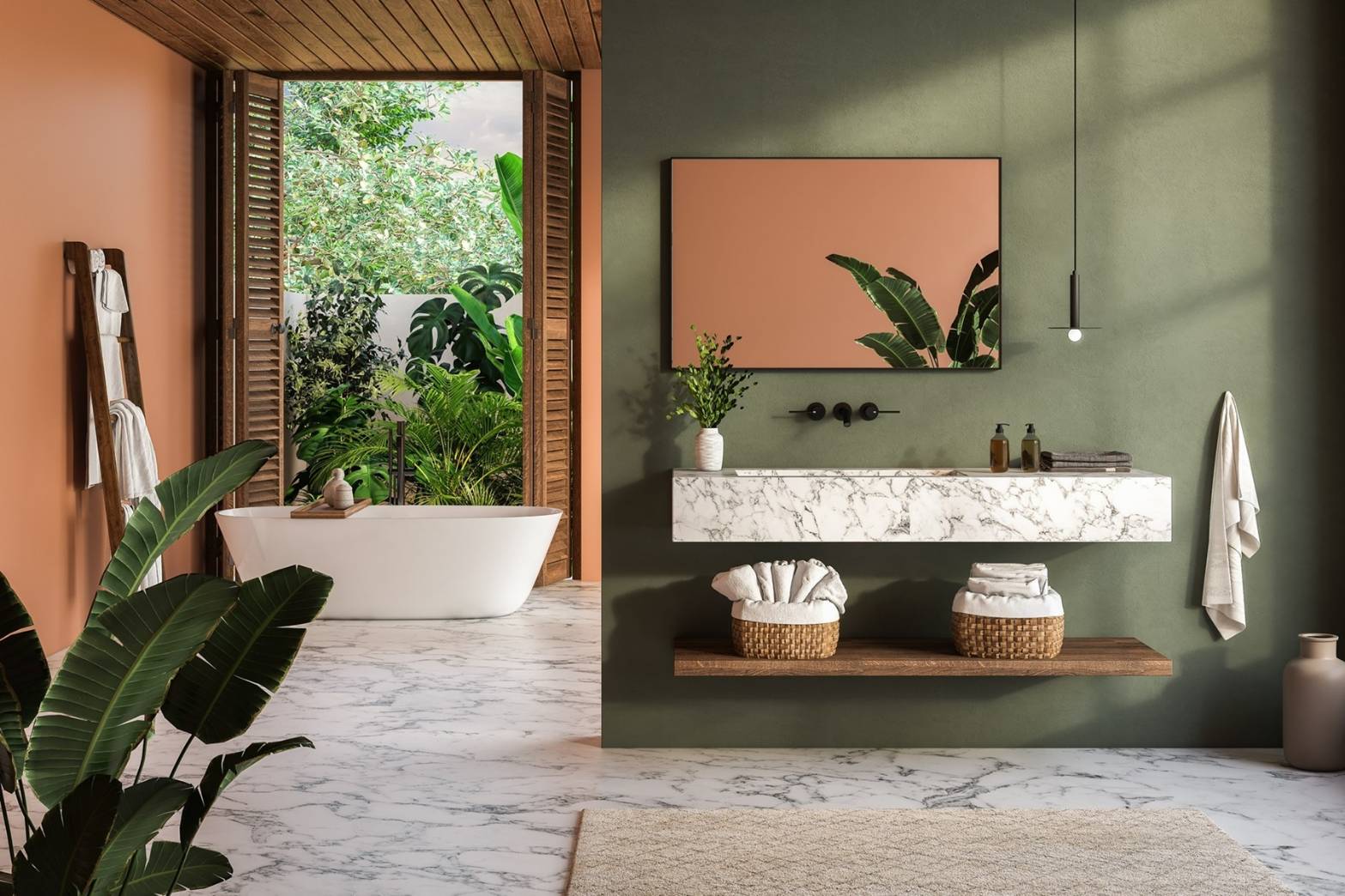 · อบอุ่นมีลูกเล่นสไตล์ Earthy Vibrancy ห้องน้ำธีมเอิร์ธโทนยังคงมาแรง แต่สามารถเพิ่มความมีชีวิตชีวาแถมไม่ซ้ำใครได้ด้วยเฉดสีธรรมชาติที่เข้มและจัดจ้านขึ้น อย่างสีเหลืองดินเผา สีเขียวมะกอก หรือสีครามเข้ม ช่วยเพิ่มมิติให้ดูอบอุ่น มีชีวิตชีวา สะท้อนความเป็นธรรมชาติ