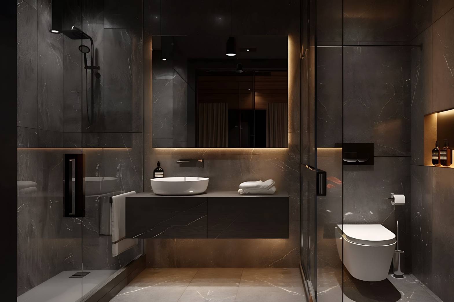 · สร้างมิติชวนค้นหาด้วย Dark Dramatics ห้องน้ำคุมธีมสีดำและเทาเข้ม จับคู่กับการจัดแสงสลัวแบบ Dim-light ถือเป็นดีไซน์ยอดฮิตตลอดกาล ให้ไวบ์คมเข้ม ถูกใจสุภาพบุรุษและคนรักการตกแต่งสไตล์โมเดิร์น