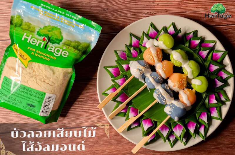 เมนูของหวานไทยๆ “บัวลอยเสียบไม้” เมนูขวัญใจรุ่นเล็กรุ่นใหญ่ เนื้อเหนียวนุ่มหนึบหนับ หอมละมุนกะทิและมีสีสันน่ารับประทาน วันนี้แบรนด์เฮอริเทจเพิ่มความอร่อยยิ่งขึ้นโดยการนำ อัลมอนด์ผงดิบ แบรนด์ เฮอริเทจมาทำเป็นไส้บัวลอย หอมอร่อยจากไส้อัลมอนด์เต็มคำ และยังอุดมไปด้วยคุณประโยชน์ทางสุขภาพ อาทิ วิตามินอี แมกนีเซียม และโพแทสเซียม ซึ่งมีฤทธิ์ต้านอนุมูลอิสระ ผสานกับความหอมละมุนของกะทิราดหน้าบัวลอย อร่อยลงตัวใครได้ทานก็ติดใจทุกคน