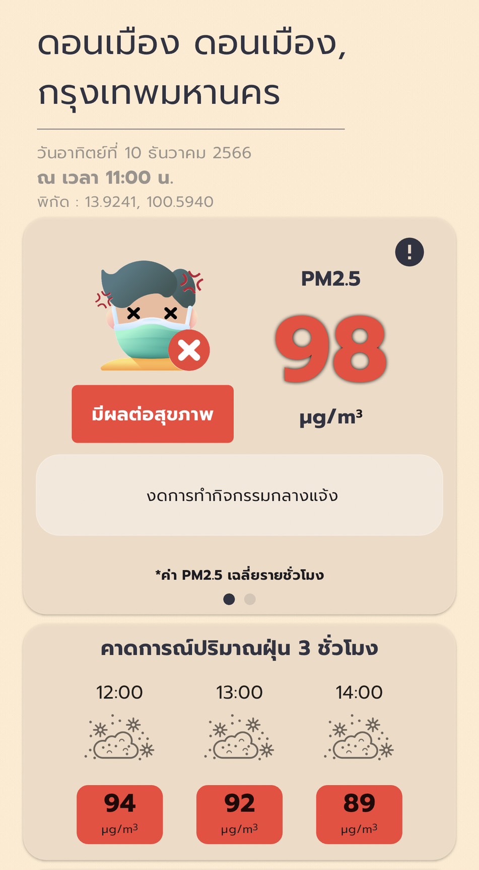 GISTDA เกาะติดสถานการณ์ฝุ่น PM 2.5 ด้วยข้อมูลจากดาวเทียมผ่านแอปพลิเคชั่น “เช็คฝุ่น” (เวลา 11.00 น. ของวันที่ 10 ธันวาคม 2566) พบ 52 จังหวัดของประเทศไทย มีค่าฝุ่นเกินมาตรฐานที่ส่งผลต่อสุขภาพระดับสีแดง 14 จังหวัด สูงสุด 5 อันดับแรก คือ สมุทรปราการ กรุเทพมหานคร นนทบุรี ปทุมธานี และอ่างทอง ในขณะที่อีก 38 จังหวัด เริ่มมีผลกระทบต่อสุขภาพในระดับสีส้ม