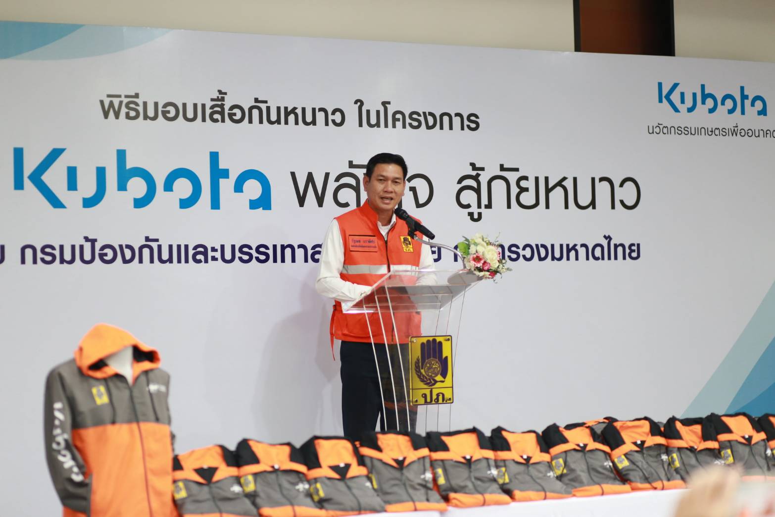 ด้าน นายรัฐพล นราดิศร รองอธิบดีกรมป้องกันและบรรเทาสาธารณภัย กล่าวว่า “สำหรับปีนี้ เป็นการดำเนินโครงการร่วมกันระหว่างกรมป้องกันและบรรเทาสาธารณภัย กับ สยามคูโบต้า ต่อเนื่องเป็นปีที่ 4 ในฐานะหน่วยงานกลางของภาครัฐในการดำเนินการป้องกันและบรรเทาสาธารณภัยของประเทศ เราได้เตรียมความพร้อมในการช่วยเหลือผู้ประสบภัยหนาวโดยเป็นศูนย์กลางการประสานการช่วยเหลือฯ โดยเฉพาะในพื้นที่จังหวัดที่เสี่ยงภัยหนาว เน้นกลุ่มเปราะบางในพื้นที่ที่ห่างไกลทุรกันดาร โดยได้วางแผนส่งมอบเสื้อกันหนาว ในพื้นที่เป้าหมาย 5 จังหวัด ได้แก่ จังหวัดบุรีรัมย์ บึงกาฬ สุรินทร์ พิจิตรและอุทัยธานี ซึ่งเป็นจังหวัดที่มีความต้องการเครื่องนุ่งห่มกันหนาวและเป็นพื้นที่ที่คาดว่าจะเกิดภัยหนาวตามการคาดการณ์ของกรมอุตุนิยมวิทยา”