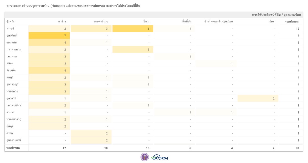 ทั้งนี้ จากข้อมูลจุดความร้อนที่รายงานโดย GISTDA เมื่อวันที่ 14 ธันวาคม 2566 พบจุดความร้อนทั้งประเทศ 90 จุด ส่วนใหญ่พบในพื้นที่การเกษตร 49 จุด ตามด้วยพื้นที่สปก. 21 จุด ชุมชนและอื่นๆ 13 จุด ป่าสงวนแห่งชาติ 4 จุด พื้นที่ริมทางหลวง 2 จุด และป่าอนุรักษ์ 1 จุด จังหวัดที่พบจำนวนจุดความร้อนสูงสุด 3 อันดับแรก คือ #สระบุรี 12 จุด #อุตรดิตถ์ 7 จุด และ #ขอนแก่น 5 จุด