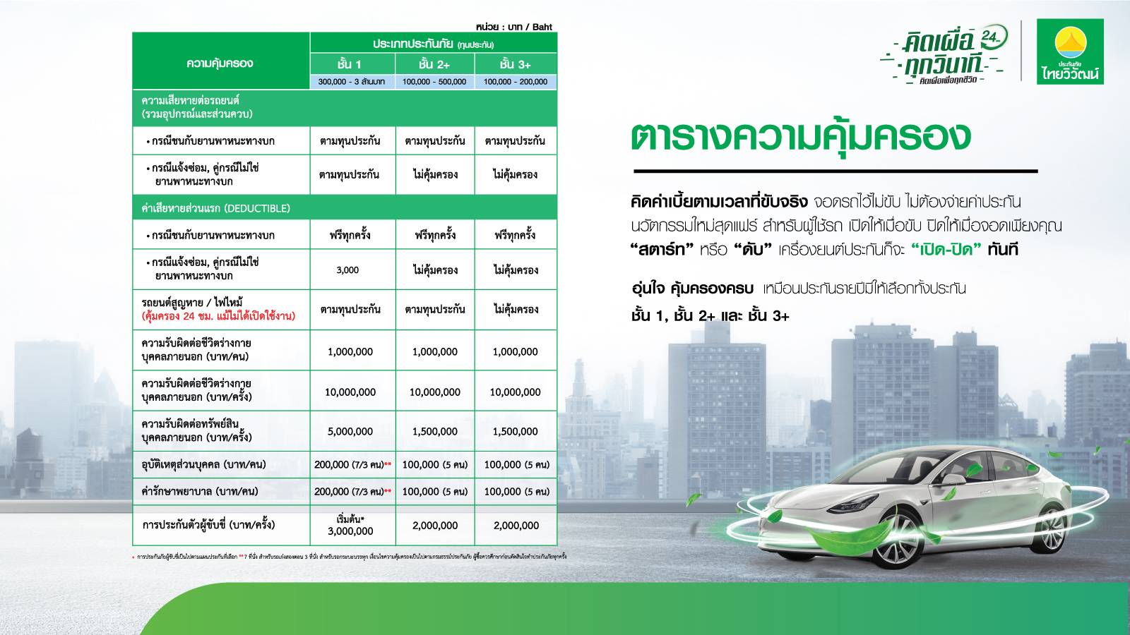 นายเทพพันธ์ กล่าวเพิ่มเติมว่า สำหรับแผนประกันรถเปิดปิด รถยนต์ EV ผู้ใช้บริการสามารถเลือกรับความคุ้มครองได้อย่างอิสระตามไลฟ์สไตล์การใช้รถของแต่ละบุคคล ซึ่งมีทั้งแบบ Package และแบบ Top-up เพิ่มชั่วโมง เหมือนแผนประกันรถเปิดปิดแผนปกติ อีกทั้งยังคุ้มครองครอบคลุม ทั้งประเภท 1 2 และ 3 โดยมีค่าเบี้ยประกันภัยชั้น 1 เริ่มต้น 6600 บาทประกันภัยชั้น 2 ค่าเบี้ยเริ่มต้น 1900 บาท และประกันภัย ชั้น 3 ค่าเบี้ยเริ่มต้น 1700 บาท ซึ่งช่วยประหยัดค่าเบี้ยสูงสุดถึง 60% เมื่อเปรียบเทียบกับราคาเบี้ยทั่วไปในตลาด ภายใต้ความคุ้มครองครบตลอด 24 ชั่วโมง พร้อมครอบคลุมทุกความคุ้มครองที่จำเป็น ทั้งความเสียหายต่อตัวรถยนต์จากอุบัติเหตุ ความรับผิดชอบชีวิตและทรัพย์สินของบุคคลภายนอก ความเสียหายต่อรถยนต์ กรณีสูญหายหรือไฟไหม้ การประกันอุบัติเหตุส่วนบุคคล การประกันภัยค่ารักษาพยาบาล และการประกันตัวผู้ขับขี่ โดยแผนประกันภัยสามารถรองรับครอบคลุมรถยนต์ EV จากหลากหลายค่ายรถยนต์ อาทิ TESLA CHANGAN BYD MG NETA และ ORA เป็นต้น
