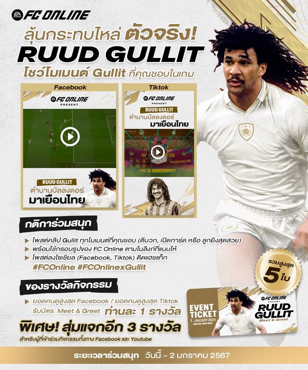 FC Online เซอร์ไพรซ์แฟนคลับและวงการฟุตบอลชาวไทย โดยจะพา Ruud Gullit เจ้าของบัลลงดอร์ 1 สมัย มาเยือนประเทศไทย ในวันที่ 7 มกราคม 2567 เพื่อร่วมงาน Meet & Greet ซึ่งจะจัดขึ้น ณ สามย่าน มิตรทาวน์ แฟนคลับทุกท่านสามารถร่วมกิจกรรมกับ FC Online ได้ง่าย ๆ เพื่อคว้าสิทธิ์ร่วมงาน Meet & Greet และกระทบไหล่ Ruud Gullit รวมถึงเหล่าอินฟูลเอนเซอร์ในวงการฟุตบอลมากมาย อาทิ เบลล์ ขอบสนามเกมส์เอง ขอบสนาม เจ๊ดำ ยักษ์ จิตกร ศรีคำเครือ ฟุ บลูมูน ดูบอลแบบแฟร์แฟร์ เรื่องของพลอย Got Gooner Petr Boat โคตรแอ็ค ทันข่าวลิเวอร์พูลจารย์บี ปีศาจแดงอ๋อง แมนยูสู้ตาย เดอะนัท ซัดหมดแม็ก เชียร์บอลกับเอิร์น เรเซอร์เบนซ์ และ เบ๊น อาปาเช่