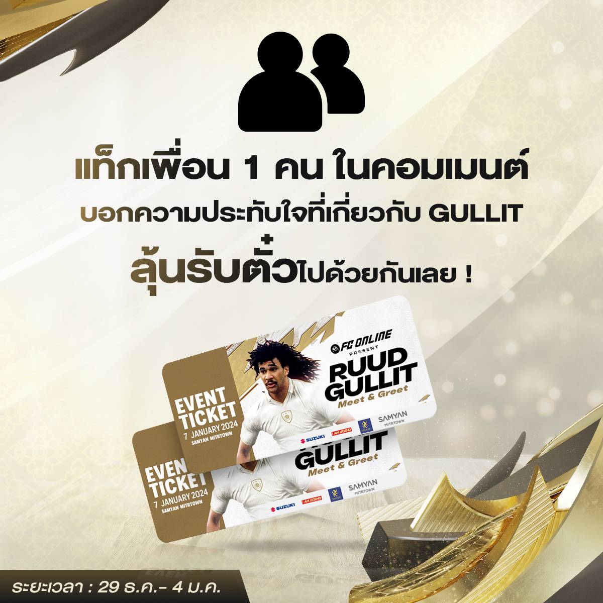 กิจกรรมที่ 2: คอมเมนต์บอกความประทับใจที่เกี่ยวกับ GULLIT พร้อมแท็กเพื่อน 1 คน ใต้โพสต์กิจกรรมที่ FC Online จะโพสต์ในวันที่ 29 ธ.ค. 2566 ทาง Facebook ของ EA Sports FC Online Thailand เพื่อลุ้นรับตั๋วร่วมงาน Meet & Greet 2 ใบ ไปกระทบไหล่กุลลิตกับเพื่อนแบบแพ็กคู่ จำนวน 1 รางวัล