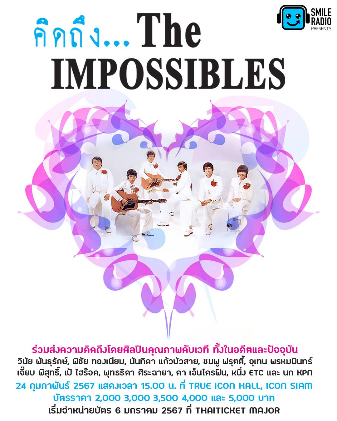 CONCERT “คิดถึง...THE IMPOSSIBLES” วันเสาร์ที่ 24 กุมภาพันธ์ 2567 เริ่มแสดงเวลา 15.00 น. ที่ TRUE ICON HALL [ ICON SIAM] บัตรราคา 2000.- / 3000.- / 3500.- / 4000.- และ 5000.- บาท ซื้อบัตรได้แล้ววันนี้ ที่ THAITICKET MAJOR พิเศษสุดสำหรับ ผู้ที่ซื้อบัตรราคา 3500 บาทขึ้นไปรับเลย(!!)ไดอารี่ 50 ปี ของ The Impossible ด่วน จำนวนจำกัด (!!)