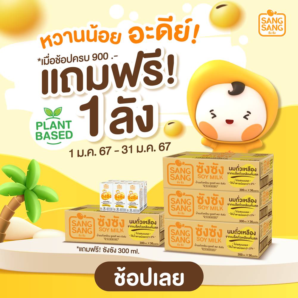 นอกจากนี้ ยังมีโปรโมชันอิ่มอร่อยกับนมถั่วเหลืองซังซัง ได้โปรตีนเน้น ๆ หวานนน้อย ได้สุขภาพดี เพียงช้อปซังซังทุกขนาดรวม 900 บาท ขึ้นไปเเถมซังซัง 300 มล 1 ลัง บริการส่งฟรี สั่งซื้อได้ที่ http://bit.ly/sangshop ระยะเวลาโปรโมชัน ตั้งแต่วันนี้ถึง 31 ม.ค. 67