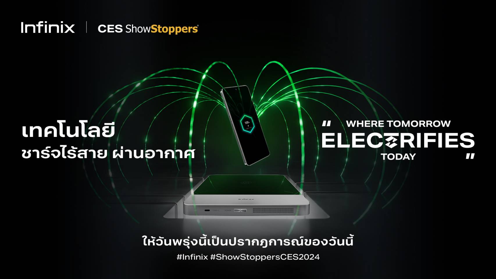 ภายในงาน Infinix ได้เผยเทคโนโลยีชาร์จไร้สาย ผ่านอากาศ (Aircharge) และเทคโนโลยีปรับอุณหภูมิแบตตามสภาพอากาศ (Extreme-Temp Battery) โดย Aircharge ใช้เทคโนโลยีแม่เหล็กแบบมัลติคอยล์และอัลกอริธึมที่ปรับเปลี่ยนได้ของ Infinix ช่วยให้สามารถชาร์จโดยไร้สายได้มากถึง 20 เซนติเมตร และเอียงสูงสุด 60 องศา นอกจากนี้ ยังคำนึงถึงความปลอดภัยของผู้ใช้ ด้วยการทำงานที่ความถี่ต่ำกว่า 6.78MHz แต่ให้พลังการชาร์จสูงถึง 7.5W